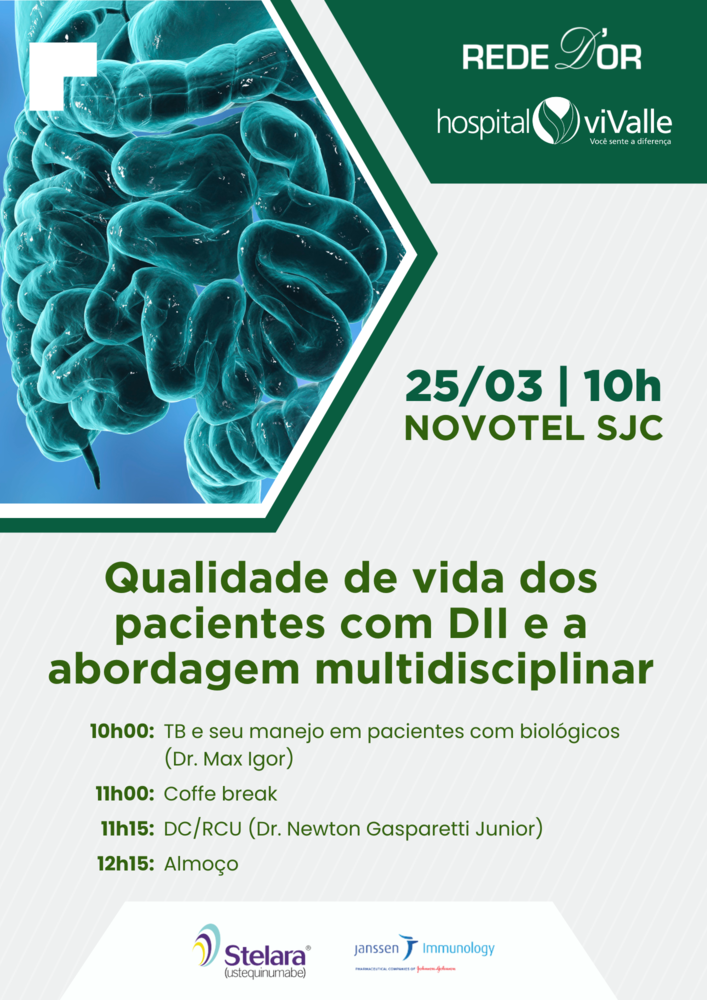 Stelara - ustequinumabe, Janssen Immunology e IEP viValle promovem no dia 25 de março (sábado), às 10h, no Novotel, em São José dos Campos, uma aula presencial sobre "Qualidade de vida dos pacientes com DII e a abordagem multidisciplinar".